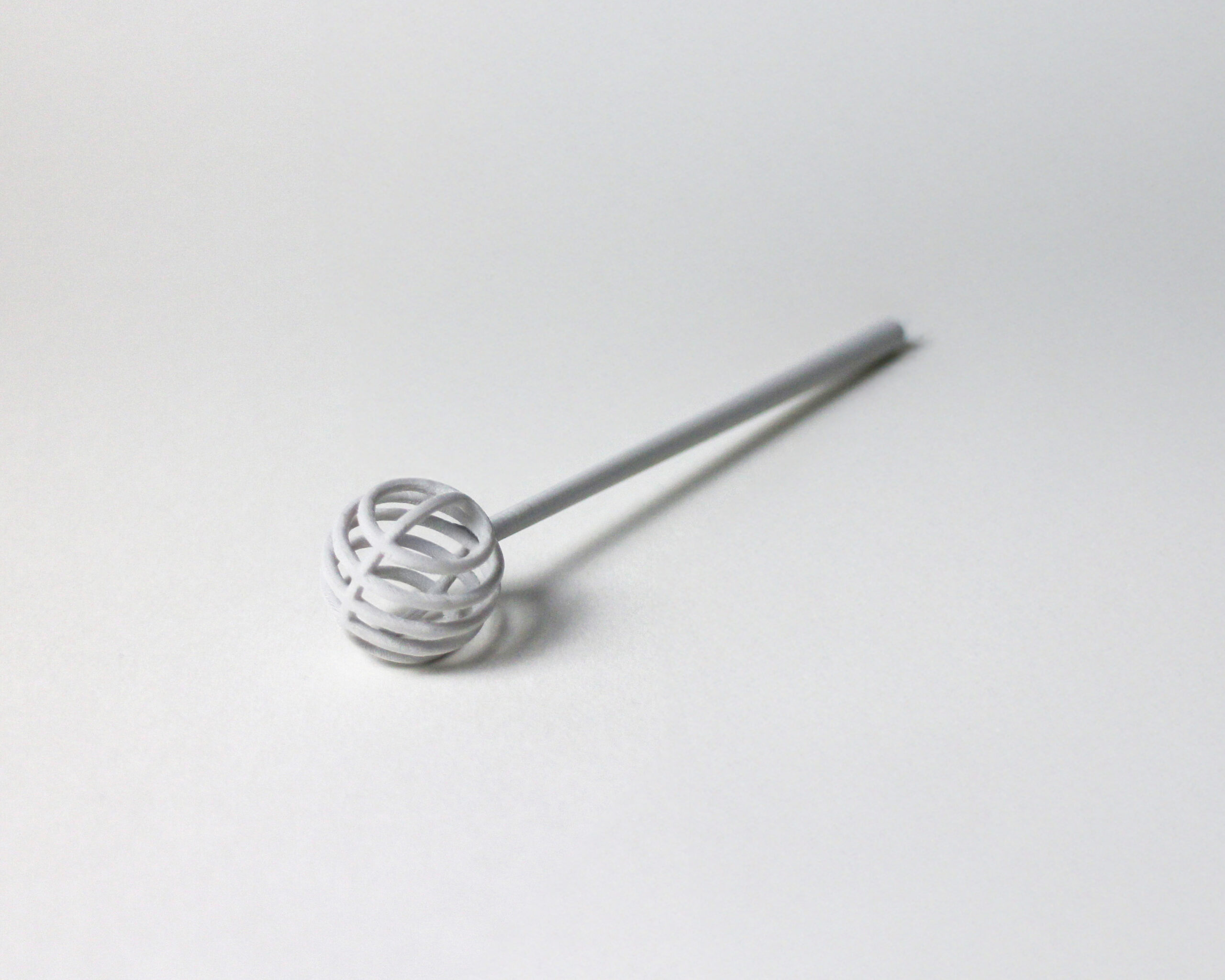 A project designed for About: Lille is a honey dipper. A series of lines branch out from a round section to create a spherical grid.